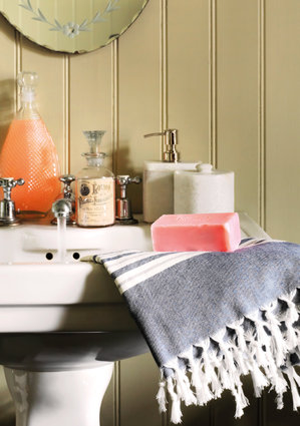 Η τελευταία τάση στο ντιζάιν είναι το vintage. Εφαρμόστε το στο μπάνιο σας βάζοντας χρωματιστά σαπούνια, πολύχρωμα αξεσουάρ αλλά και παλιά μπουκαλάκια. Επίσης πετσέτες σε αποχρώσεις άσπρου-μπλε θα προσέθεταν στο μπάνιο σας λίγη γαλλική φινέτσα.
