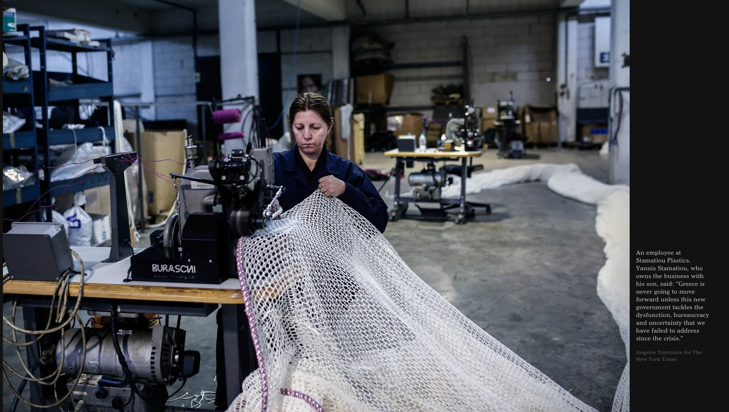 Ο 26χρονος Φίλιππος Σταματίου εκφράζει στην αμερικανική εφημερίδα την άποψη πως «η κυβέρνηση πρέπει να υιοθετήσει την ίδια προσέγγιση σχετικά με την αποδοτικότητα, αναδομώντας την ίδια την κυβέρνηση, όπως έκανε ο πατέρας του, για τον εξορθολογισμό της εταιρείας». «Πριν από την κρίση» γράφει η Αλντερμαν, «η επιχείρηση ήταν μία από τα δεκάδες εργοστάσια πλαστικών στη χώρα, που κατασκεύαζαν υλικά εξοπλισμού για ιχθυοτροφεία. Οταν η κατασκευή κατέρρευσε κατά τη διάρκεια της κρίσης, ο Γιάννης Σταματίου έριξε περισσότερα λεφτά στην ιχθυοκαλλιέργεια. Τώρα πια εξάγει εργαλεία ιχθυοκαλλιέργειας στη Μέση Ανατολή, μαζί όμως με ζωντανή τσιπούρα και λαβράκι που καλλιεργεί ο ίδιος σε ιχθυοκαλλιέργεια κοντά σε ένα ελληνικό νησί. Σήμερα είναι ένα από τα μόλις τέσσερα εργοστάσια πλαστικών που απέμειναν στην Ελλάδα».