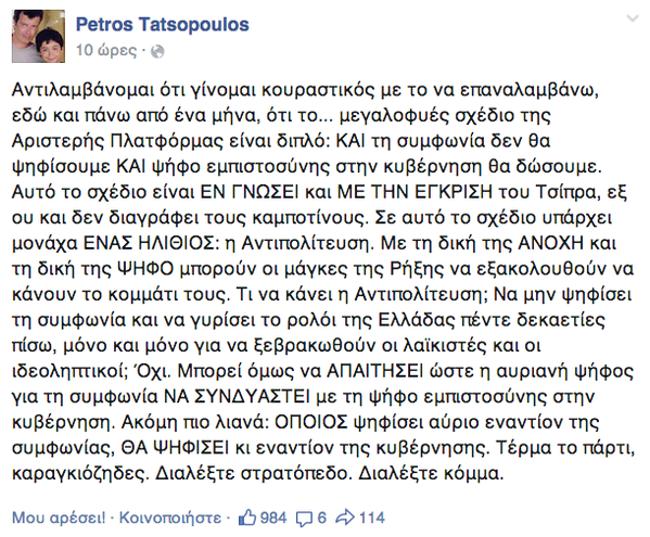 «Ο ελληνικός λαός δεν μας ψήφισε για να ψηφίσουμε με τη σειρά μας ένα νέο μνημόνιο. Προσωπικά εγώ και όλος ο ΣΥΡΙΖΑ δεν ψηφίσαμε το 1ο και το 2ο μνημόνιο και δικαιωθήκαμε. Δεν θα ψηφίσω και το τρίτο μνημόνιο που έρχεται σήμερα στη Βουλή» δήλωσε ο υπουργός ΠΑΠΕΝ στο περιστύλιο της βουλής, λίγς ώρες πριν την ψηφοφορία για την επικύρωση της συμφωνίας και την ψήφιση των μέτρων.